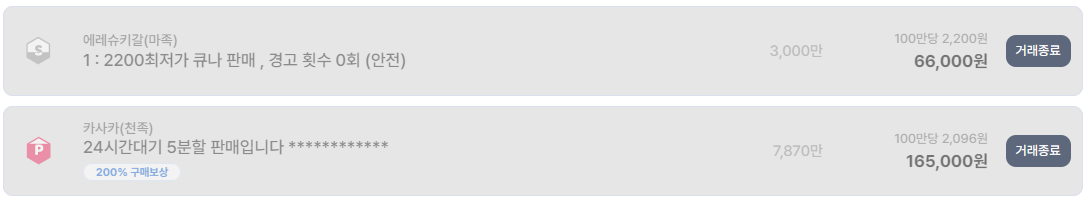 반면 소량 거래나 개인 판매의 경우 가격 편차가 상당히 크다. 4,000만 큐나 기준으로 에레슈키갈 서버에서는 100만당 2,200원에 거래 종료된 반면, 일부 개인 판매글에서는 2,700원 이상을 제시하는 경우도 확인된다. 다만 이런 고단가 매물은 체결 속도가 느린 편이며, 실제로 거래 완료된 내역은 대부분 2,100원~2,400원대에 몰려 있다. 즉, 빠른 처분을 원한다면 이 구간을 벗어나기 어렵다.