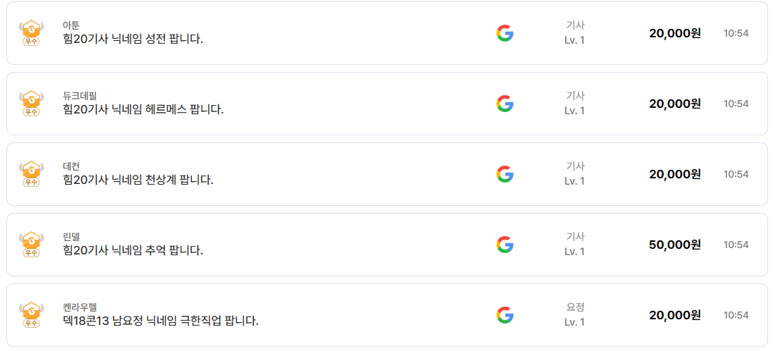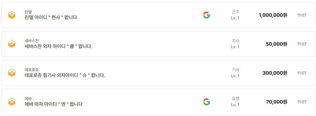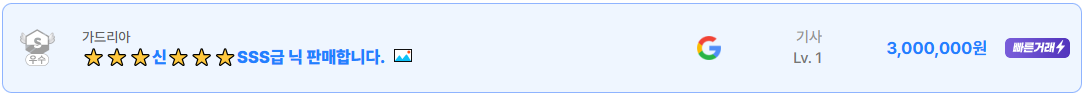 고가 거래 사례를 보면 SSS급 닉네임 + 인기 서버 조합이 핵심이다. 300만 원 이상에 등록된 ‘나이트’, ‘가드리아’ 계정은 단순 플레이 목적이 아니라 장기 보유 또는 재판매를 염두에 둔 거래로 보인다. 이런 계정들은 가격 변동이 적고, 시간이 지나도 가치 하락이 크지 않은 편이다.
