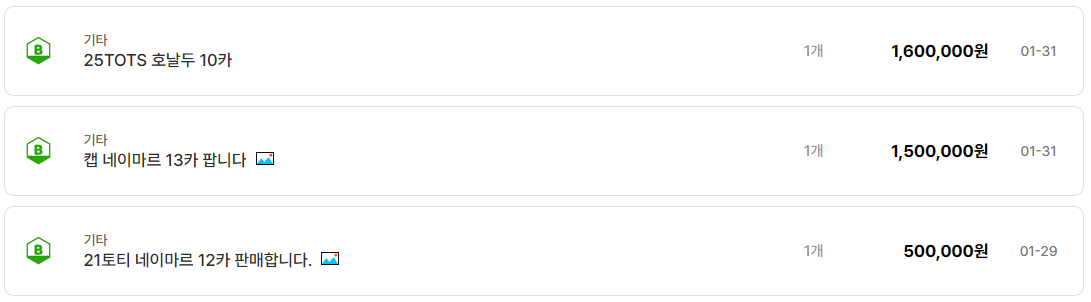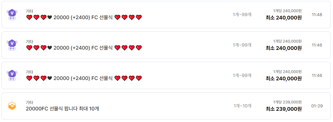 또 하나 중요한 흐름은 FC 선물식 거래다. 20,000FC + 추가 보너스 구성의 선물식 상품이 개당 23만 원 후반에서 24만 원 초반에 다수 등록되어 있다. 동일한 조건의 거래가 반복적으로 올라온다는 점에서, 현질을 통한 BP 확보와 고강 카드 직강을 동시에 노리는 유저가 꾸준히 존재함을 알 수 있다. 이는 직접 패키지를 구매하는 것보다 효율적인 루트를 찾는 소비 성향이 자리 잡았다는 뜻이기도 하다.
