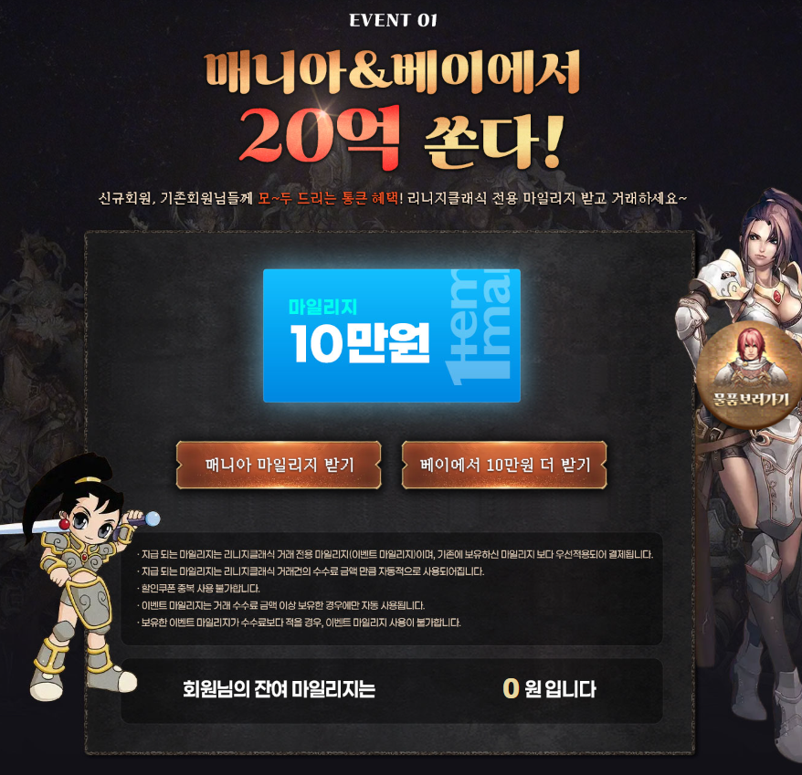 베이 연계 이벤트: 아이템 베이에서도 리니지 클래식 전용 랜딩 페이지를 통해 별도의 지원금과 혜택을 제공하고 있으니 양쪽 플랫폼을 모두 체크해 보시기 바랍니다.