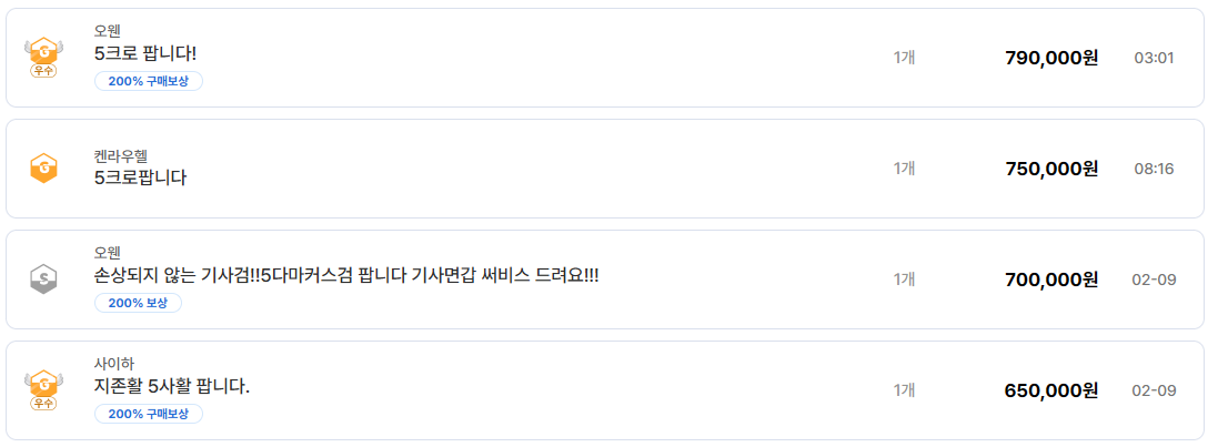 5크로, 5일도, 5다마커스검 같은 5강 무기들도 700,000원~800,000원대에서 꾸준히 거래되고 있다. 신규 유저나 부캐릭터 육성 수요가 받쳐주고 있는 구간이다.