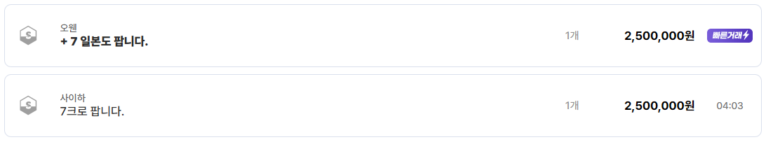 무기류에서는 +7 일본도, 7크로스보우, 레이피어 계열이 꾸준히 거래되고 있다. 오웬 서버의 +7 일본도는 2,500,000원, 사이하 서버의 7크로는 동일한 가격대에서 거래되고 있다. 이는 7강화 무기가 여전히 실사용 단계의 핵심 장비라는 점을 보여주는 사례다.