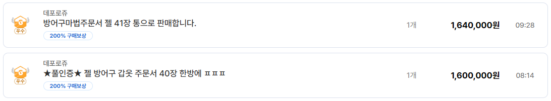 젤 계열 아이템 역시 꾸준한 거래량을 유지하고 있다. 데포로쥬 서버에서는 방어구 마법 주문서 젤 40장~41장 묶음이 1,600,000원~1,640,000원에 거래되고 있으며,