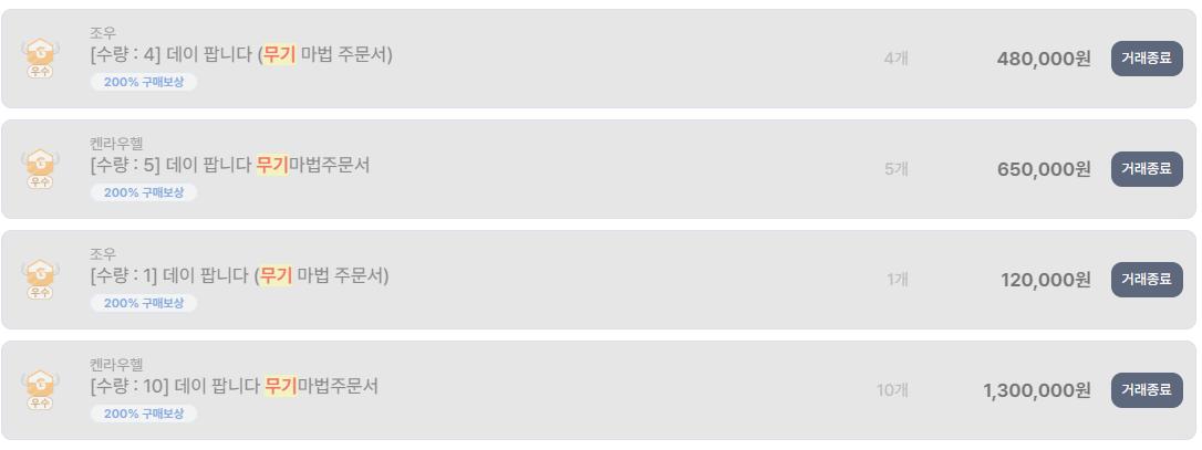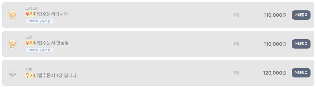 조우 서버에서는 1장 120,000원 거래가 반복적으로 종료되었고, 켄라우헬 서버 역시 100,000원~130,000원 사이에서 다수 거래가 완료되었다. 오웬 서버에서는 140,000원에도 여러 건이 성사되었으며, 케레니스에서는 150,000원 거래도 확인된다. 이는 서버별 강화 수요 차이가 가격에 직접 반영된 결과로 보인다.