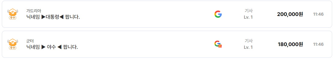 하지만 현재 기사 거래에서 핵심은 레벨보다 닉네임입니다. 실제 등록 사례를 보면 다음과 같습니다.