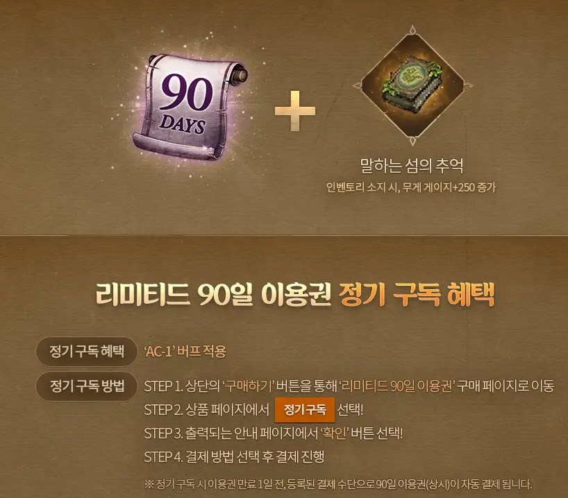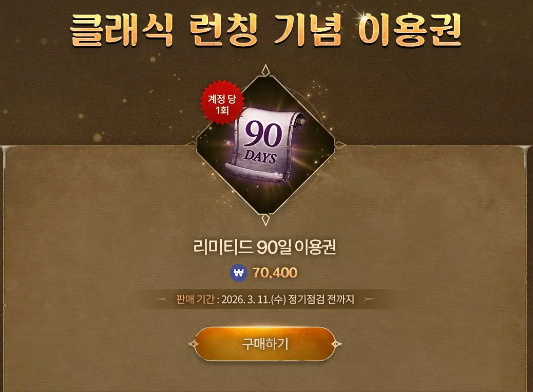 | 리미티드 90일권 | 90일 | 70,400원 | 계정당 1회, 특별 아이템 포함 상품 |