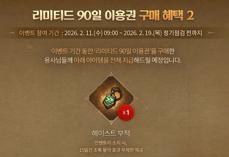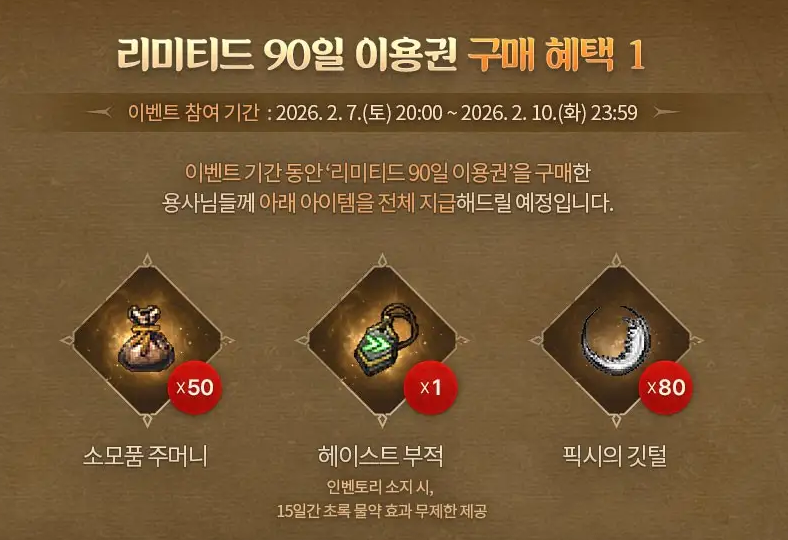 리미티드 90일 이용권을 구매한 용사님들을 대상으로 특별한 추첨 이벤트도 진행 중입니다.