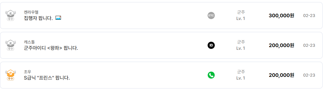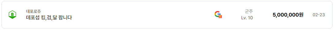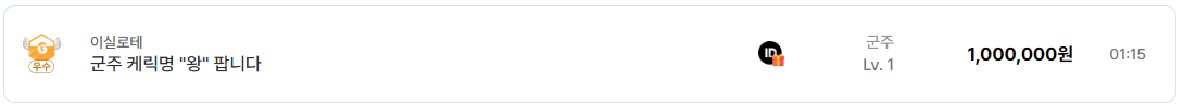 현재 확인된 매물 중 최고가다. 단순 1레벨 군주 캐릭터임에도 불구하고 2천만원이라는 가격이 책정됐다. 이는 게임 플레이 가치가 아니라 ‘상징성 + 서버 지배 이미지 + 혈맹 마케팅 효과’가 반영된 금액이다.