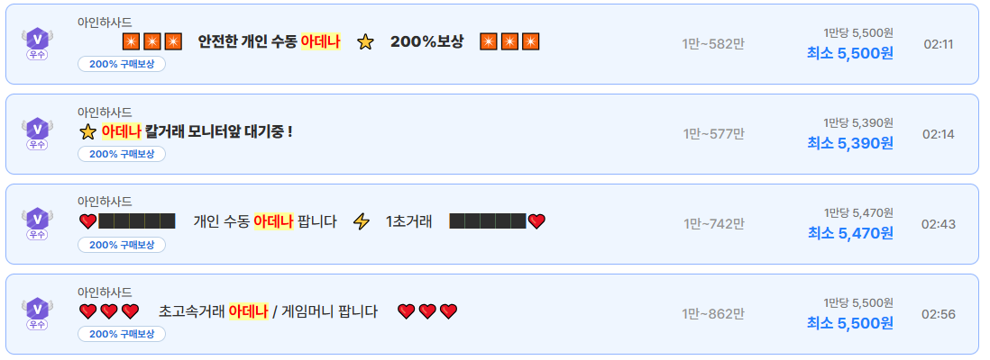 특히 제목에 실매물, 재고 보유 중, 수동 아데나와 같은 키워드를 반복적으로 사용하는 판매자들이 높은 신용 점수(5.0)를 유지하며 활발하게 거래를 성사시키고 있습니다. 구매자 입장에서는 1만 아데나당 몇 백 원의 차이보다 계정의 안전과 빠른 수령을 더 중요하게 생각하는 경향이 짙어지고 있습니다.