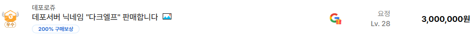 네임드 닉네임: 데포로쥬 서버의 '다크엘프' 닉네임 요정 계정은 3,000,000원이라는 고가에 매물이 올라와 있습니다. 이는 향후 업데이트될 클래스에 대한 기대감과 상징성이 반영된 결과입니다.