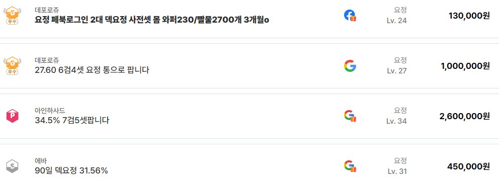 다음으로 가장 거래가 활발한 구간은 30레벨 전후 덱요정이다. 실제로 아이템매니아에 올라온 거래글을 보면 다음과 같은 가격대를 확인할 수 있다.