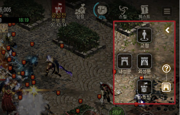 유저들의 편의를 위한 시스템도 잘 갖춰져 있습니다. 공성전이 벌어지는 공성존 내에서는 사망하더라도 별도의 경험치 하락이나 아이템 분실 같은 패널티가 적용되지 않기 때문에 적극적인 교전이 가능합니다. 또한 피아 식별 간소화 기능을 활성화하면 아군은 파란색, 적군은 빨간색으로 명확하게 구분되어 난전 속에서도 효율적인 타겟팅과 진형 유지가 가능해집니다.