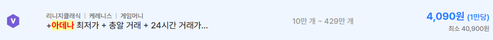 케레니스 서버는 4,090원으로 형성되어 있는데, 물량 자체가 적은 편이라 가격 변동성이 존재할 가능성이 높다.