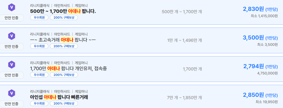 아인하사드 서버는 1만 아데나당 약 2,790원 ~ 3,500원 사이에서 거래가 이루어지고 있다. 실제 등록된 매물 중에는 2,790원, 2,830원, 2,850원 수준의 거래가 확인되며, 개인 유저 매물도 다수 존재한다.