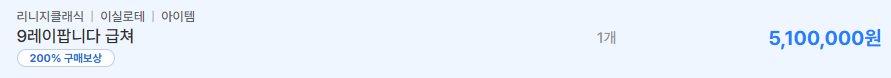 이실로테 서버: 급처 매물로 나온 9레이피어가 5,100,000원에 거래 중입니다. 기사 클래스의 주력 무기인 만큼 장궁보다도 소폭 높은 가치를 인정받고 있습니다.