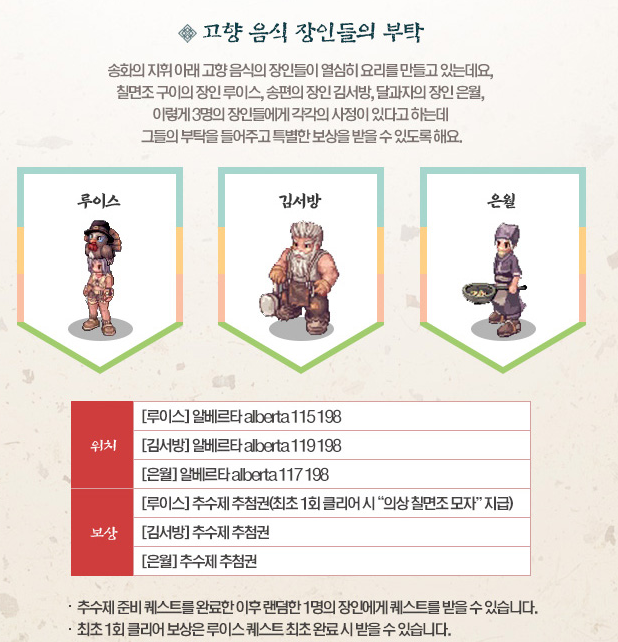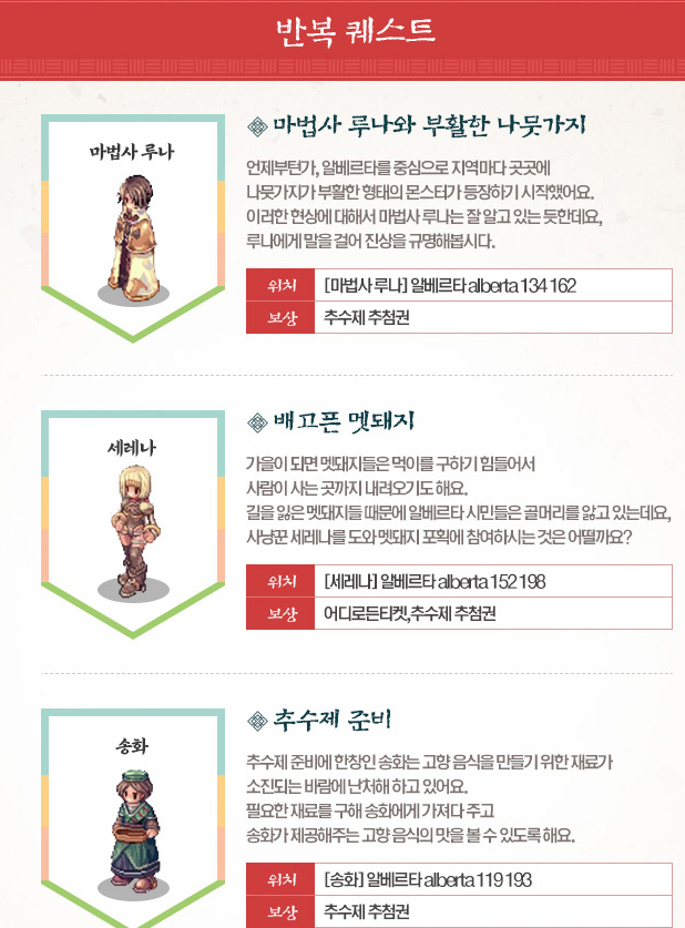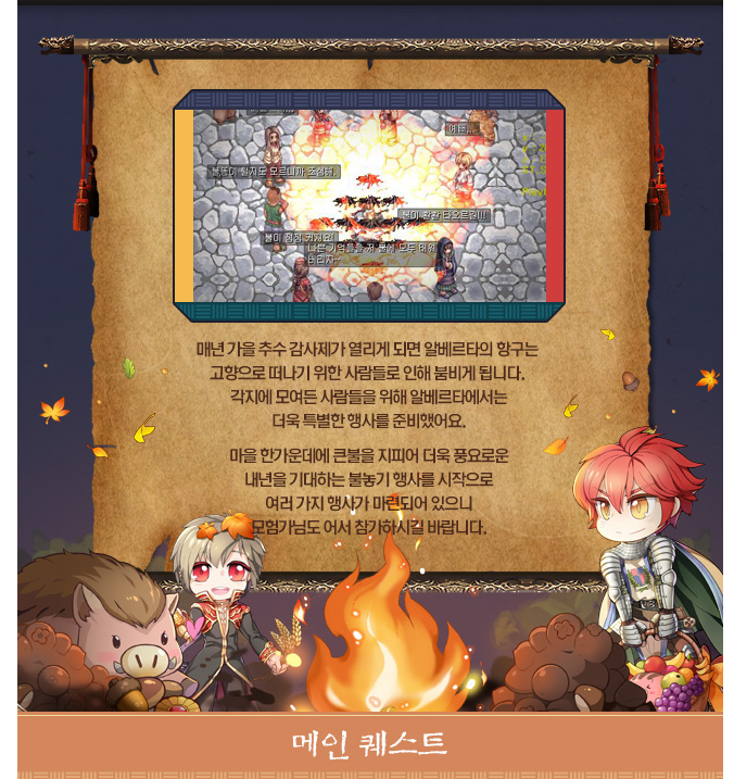 추수제 퀘스트 필요한 재료를 구해서 송화에게 가져다 주는 퀘스트입니다.
