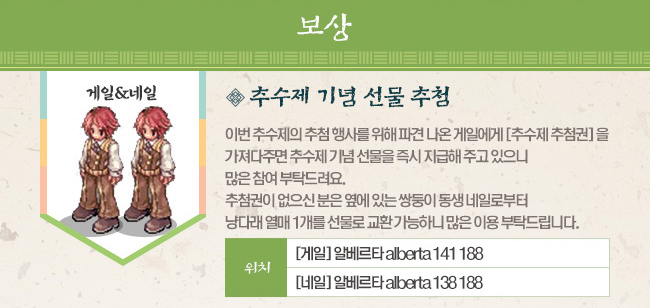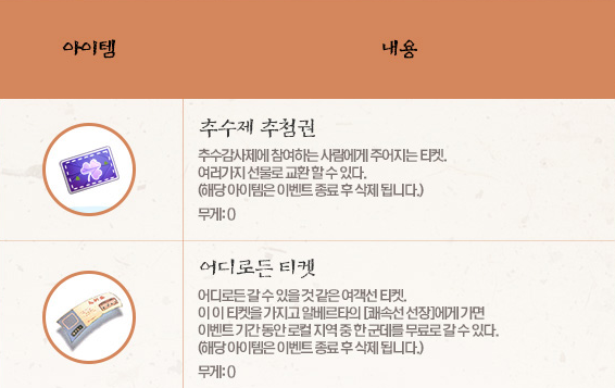 보상아이템은 추수제 추첨권과 어디로든 티켓을 획득할 수 있습니다.