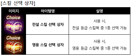 전설 영웅 스킬 선택 상자를 사용하시면 목록 내1종의 스킬북(각인)아이템을 선택해서 획득 하실 수 있습니다.