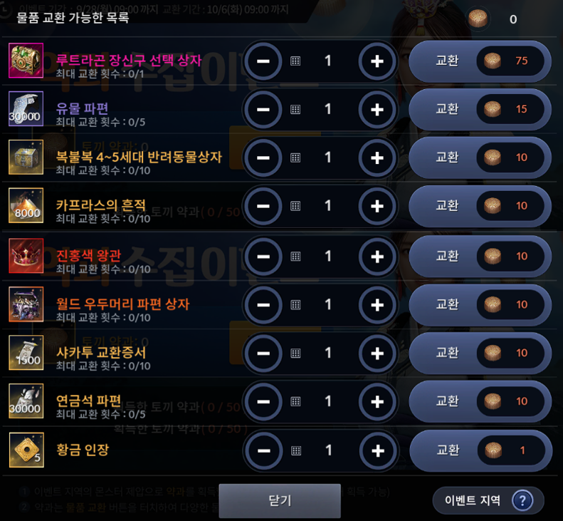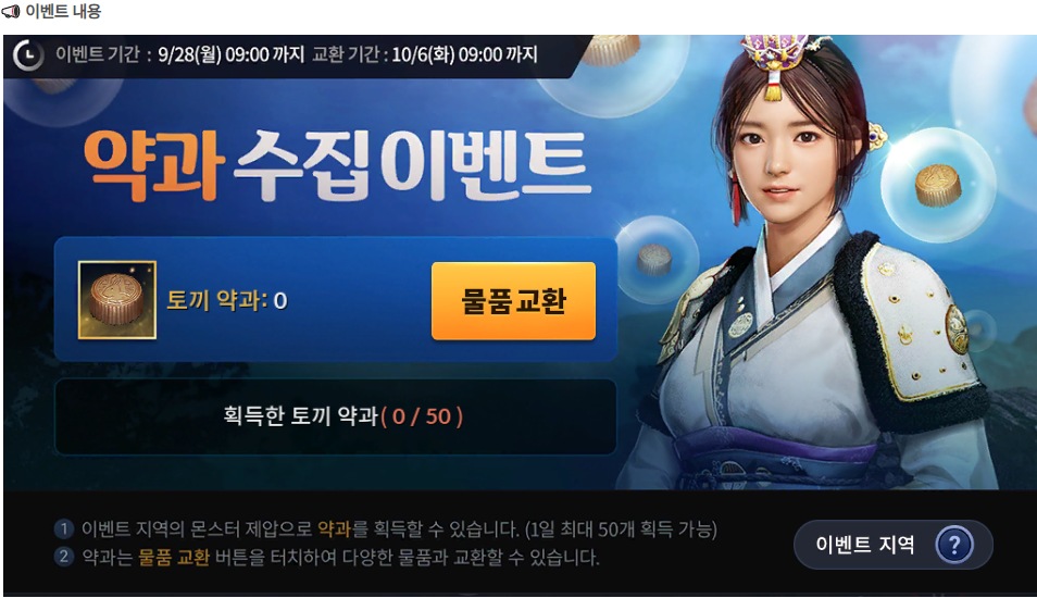 약과 교환 기간은 9월3주차 업데이트 점검 후~10월6일 화요일 09:00까지 입니다.