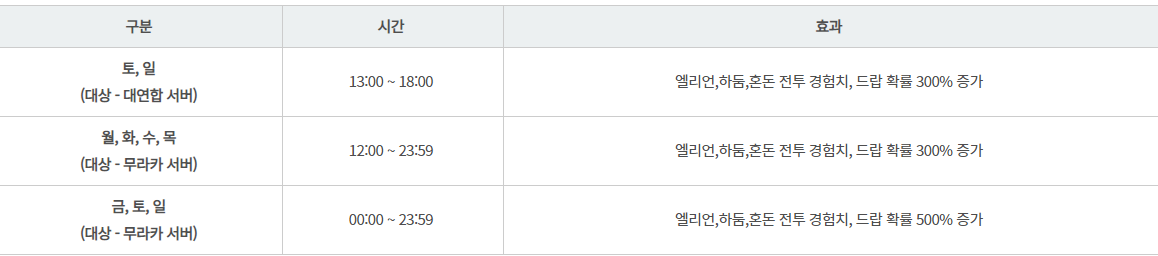 엘리언/하둠/혼 전투 경험치 및 아이템 획득 확률 증가시에는 대사막,용맹의 땅,토벌 임무,고대 유적,