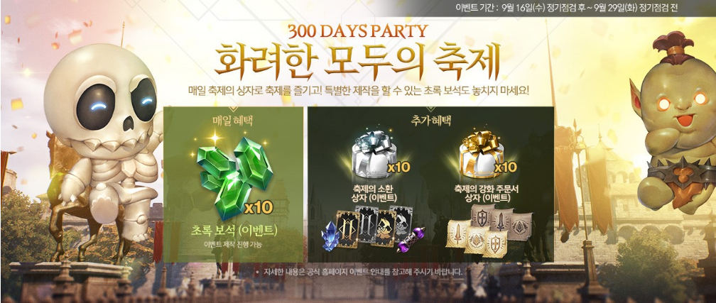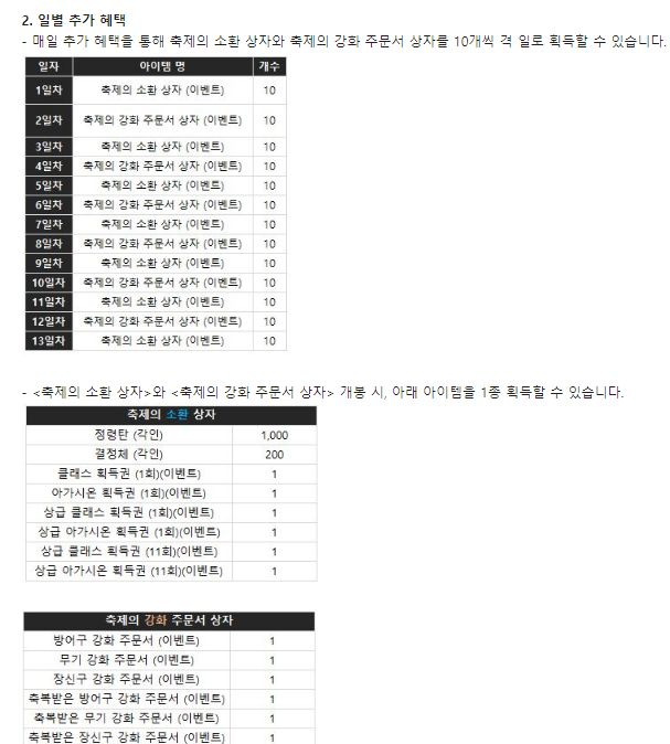 추가 혜택을 통하여 축제의 소환 상자와 축제의 강화 주문서 상자 아이템을 격 일로 10개 획득할 수 있습니다.