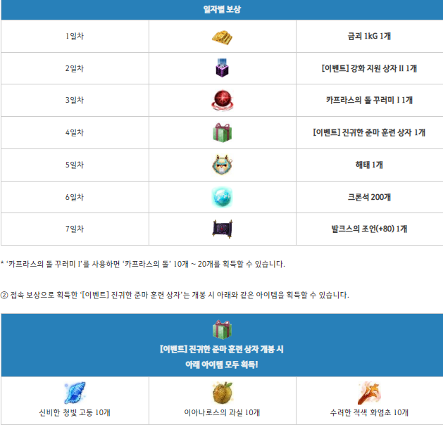 이벤트 보상으로 금괴 1KG,강화 지원 상자,카프라스의 돌 꾸러미,진귀한 준마 훈련상자,