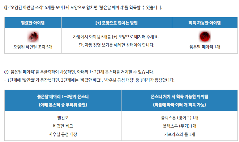 이벤트 기간에 사냥을 진행하면 확률에 따라 오염된 하얀달 조각을 획득할 수 있습니다.