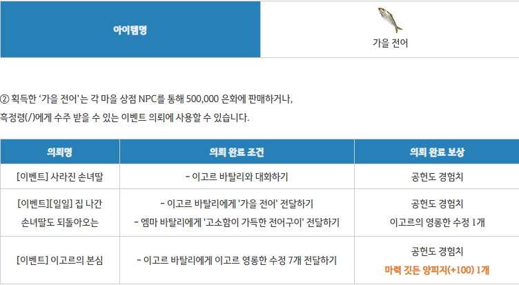 획득한 가을 전어는 각 마을 상점 NPC를 통해서 500,000은화에 판매하거나,흑정령에게 수주 받을 수 있는