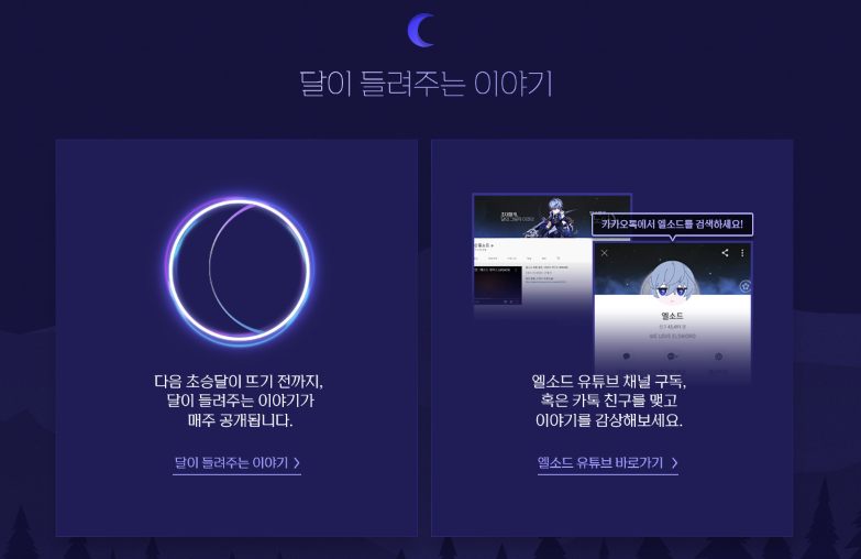 이 외에 이번 엘소드 노아 신규캐릭 사전예약 보상 아이템과 카카오톡 테마까지 확인하세요 내용에서 신규 캐릭터 노아의 스토리인 '달이 들려주는 이야기'와 엘소드 공식 유튜브 채널에 영상으로 감상하는 등 여러가지 컨텐츠가 준비되어 있으니 한 번 해보시는 것도 노아를 맞이하는데에 있어서 더욱 도움이 될 것 같습니다.