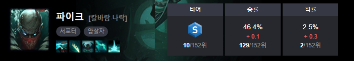 파이크 통계치 입니다. 티어의 순위는 최상위권이고 픽률 또한 2위로 엄청나지만 반대로