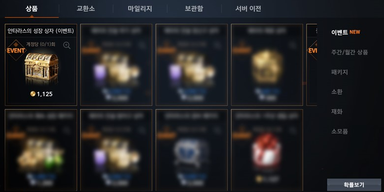 - 이벤트 기간 동안, 다이아 상점에서 안타라스의 성장 상자 (이벤트) 아이템을 1,125 아데나에 판매합니다.