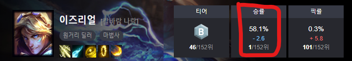 이즈리얼 통계치 인데요. 사실 티어는 그냥 2.5티어 정도로 중위권에 속하고 픽률 또한 저조한데