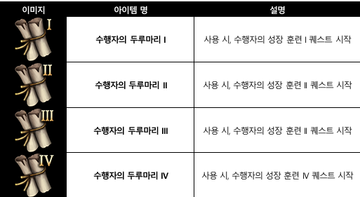 - 2021년 1월 13일 정기점검 이후, 이벤트 아이템 ‘수행자의 두루마리 상자’, ‘수행자의 두루마리 I’, ‘수행자의 두루마리 II’, ‘수행자의 두루마리 III’, ‘수행자의 두루마리 IV’는 삭제됩니다.