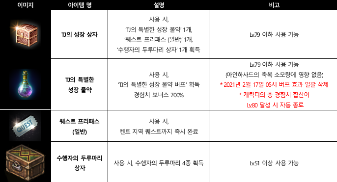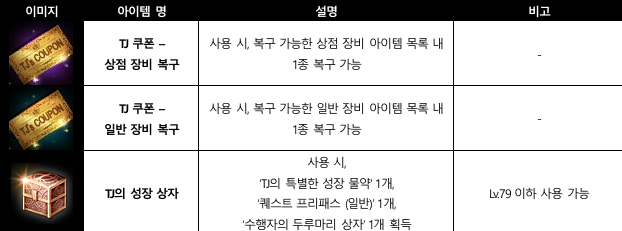 - 2021년 1월 6일 정기점검 이후, 이벤트 아이템 ‘TJ의 성장 상자’, ‘TJ의 특별한 성장 물약’, ‘퀘스트 프리패스(일반)’은 삭제됩니다.