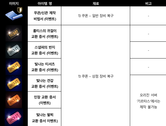 - 2020년 12월 9일 정기점검 이후, 이벤트 아이템 ‘TJ의 선물 상자’, ‘TJ 쿠폰 – 상점 장비 복구’, ‘TJ 쿠폰 – 일반 장비 복구’, ‘무관/신관 제작 비법서 (이벤트)’, ’룸티스의 귀걸이 교환 증서 (이벤트)’, ‘스냅퍼의 반지 교환 증서 (이벤트)’, ‘빛나는 티셔츠 교환 증서 (이벤트)’, 빛나는 견갑 교환 증서 (이벤트)’, ‘인장 교환 증서 (이벤트)’, ‘빛나는 팔찌 교환 증서 (이벤트)’ 아이템은 삭제됩니다.