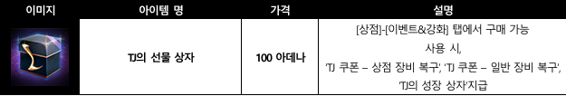 - 이벤트 기간 동안 [상점]-[이벤트&강화] 탭에서 ‘TJ의 선물 상자’가 판매됩니다.