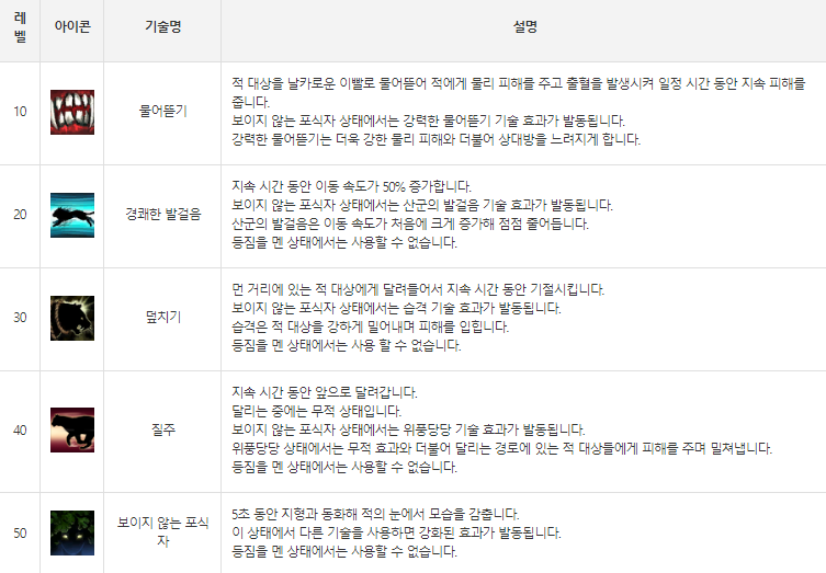 50레벨에서 보이지 않는 포식자 사용 가능