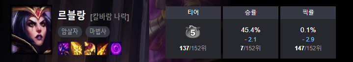 티어/승률/픽률 중에서 승률이 압도적이지만 아무래도 르블랑을 하는 사람만 하는 느낌이 드네요.