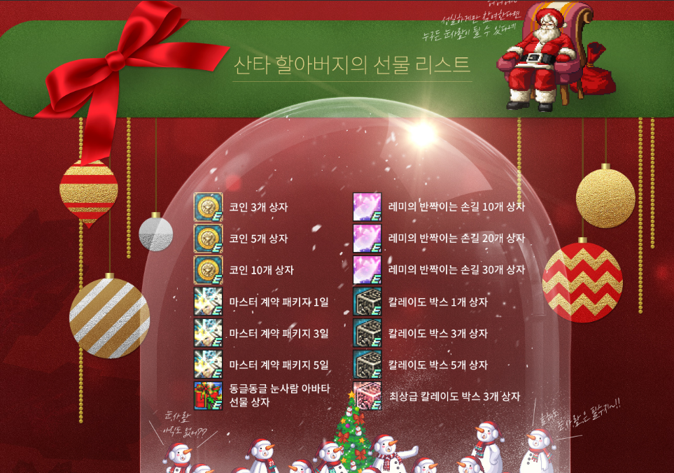 4. '가득찬 선물 양말'을 사용하면 산타 할아버지 선물 리스트 14종 중에서 랜덤하게 1종을 획득할 수 있습니다