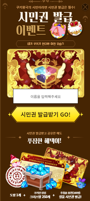 이 시민권을 발급받고 공유하면 도장1개 + 킹덤 크리스탈 250개 + 실물 시민권(소장용, 추첨으로 100명지급)