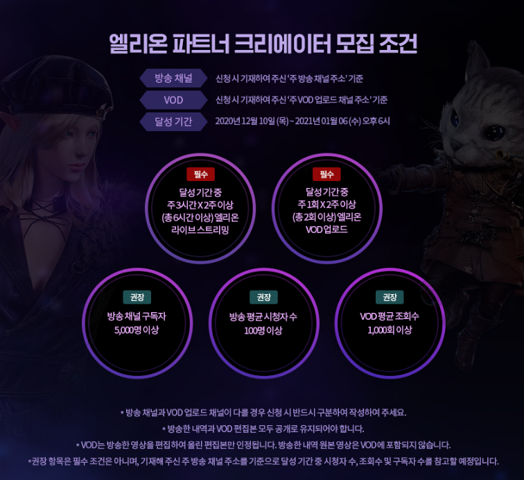 엘리온 라이브를 방송해야 하고 주1회 2주이상(총2회) 엘리온 VOD를 업로드 해야 합니다.