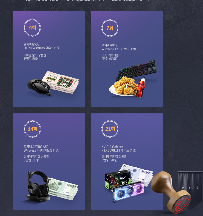 그 외에는 매주 1명, 3명씩 추첨해서 키보드,헤드셋, G7모니터, G9모니터 등등 지급하네요