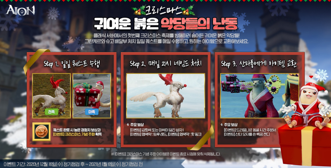 매일 이벤트 퀘스트 수행하고 다량의 경험치 보상과 크리스마스 기념 주화 아이템을 얻으세요.