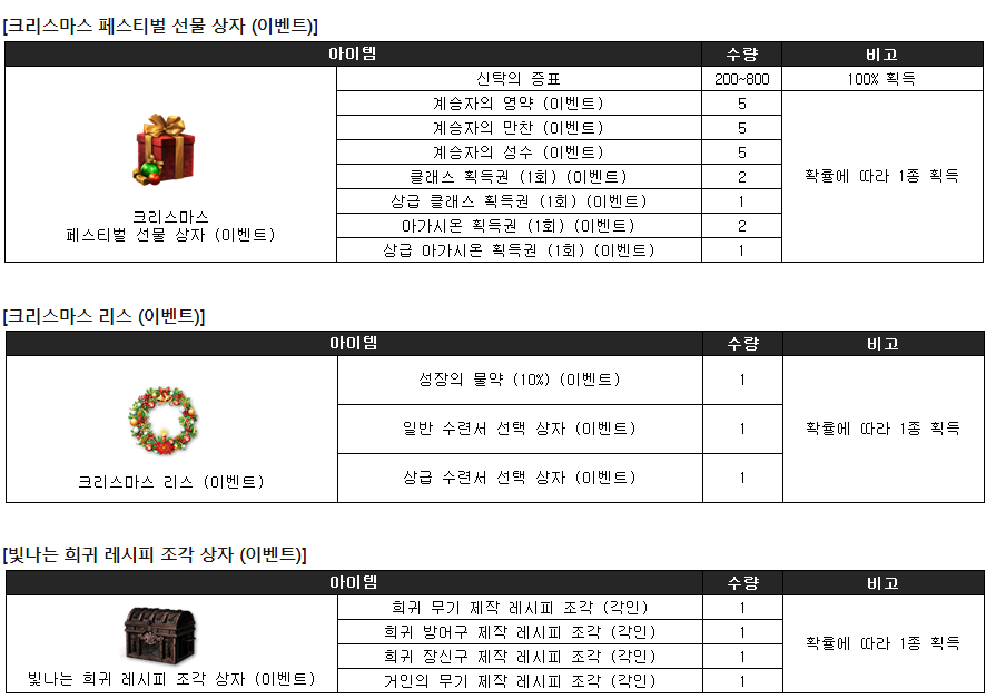크리스마스 선물 상자에서는 신탁의 증표 150~600개 100%확률로 주고 + 계승자의 영약,만찬,성수, 클래스획득권, 아가시온 획득권 중에서 1개를 확률에 따라 주네요.