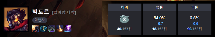 티어/픽률 그냥 그정돈데 승률은 18위로 꽤 높은 편이죠.