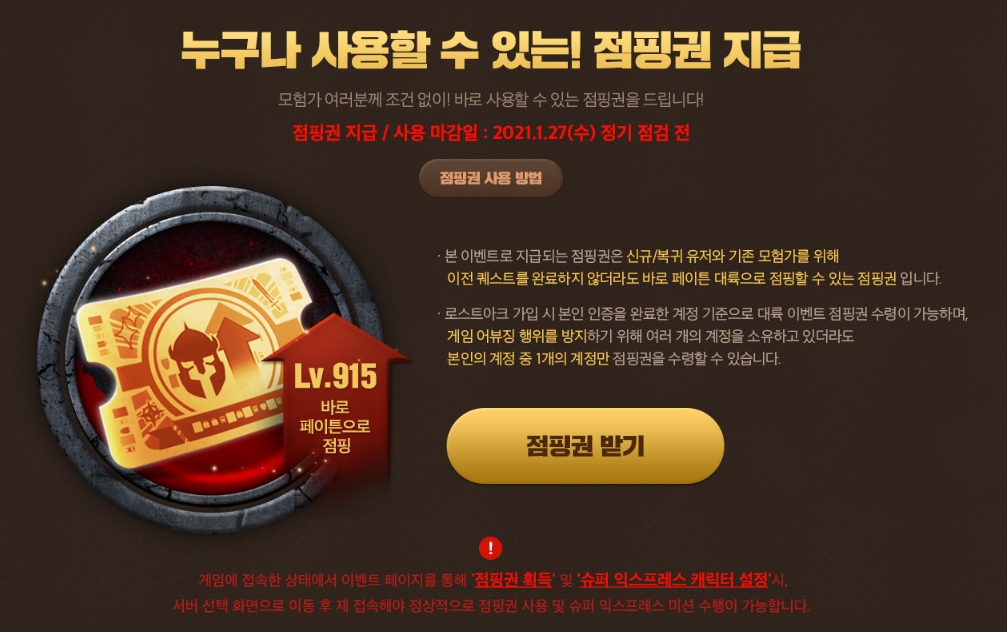915레벨 이상의 캐릭터는 점핑권을 사용할 수 없지만