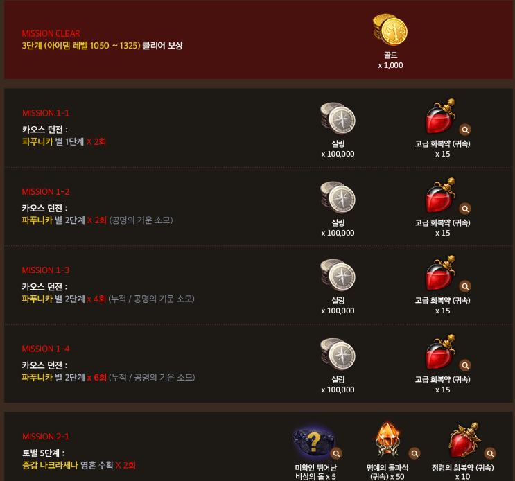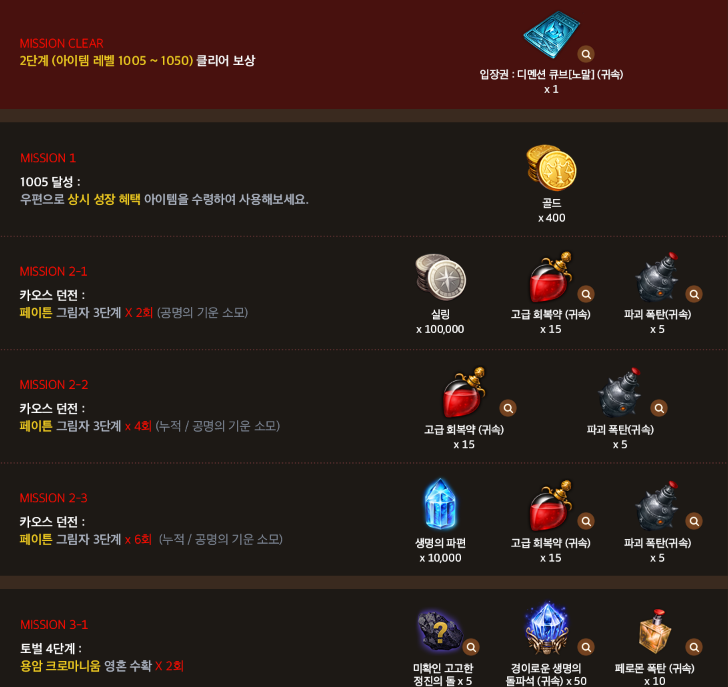 이 레벨 구간에서 각 미션을 통해 각종 기능성 아이템을 얻을 수 있네요