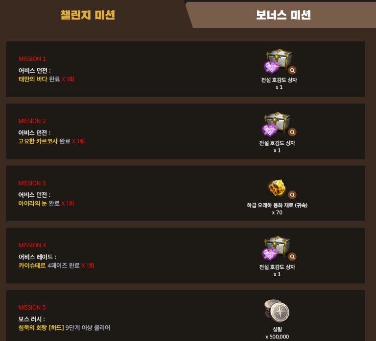 또한 각 던전을 도전하는 미션으로