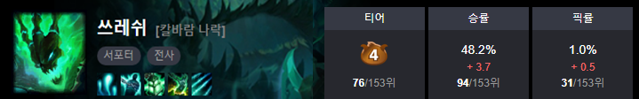 일단 설명에 앞서 쓰레쉬 티어/승률을 보면 중하위권에 속하긴 합니다.