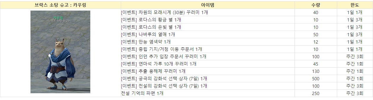 차원의 모래시계부터 시작하여 이동주문서와 연마석가루, 궁극과 전설의 강화석 선택상자와 더불어